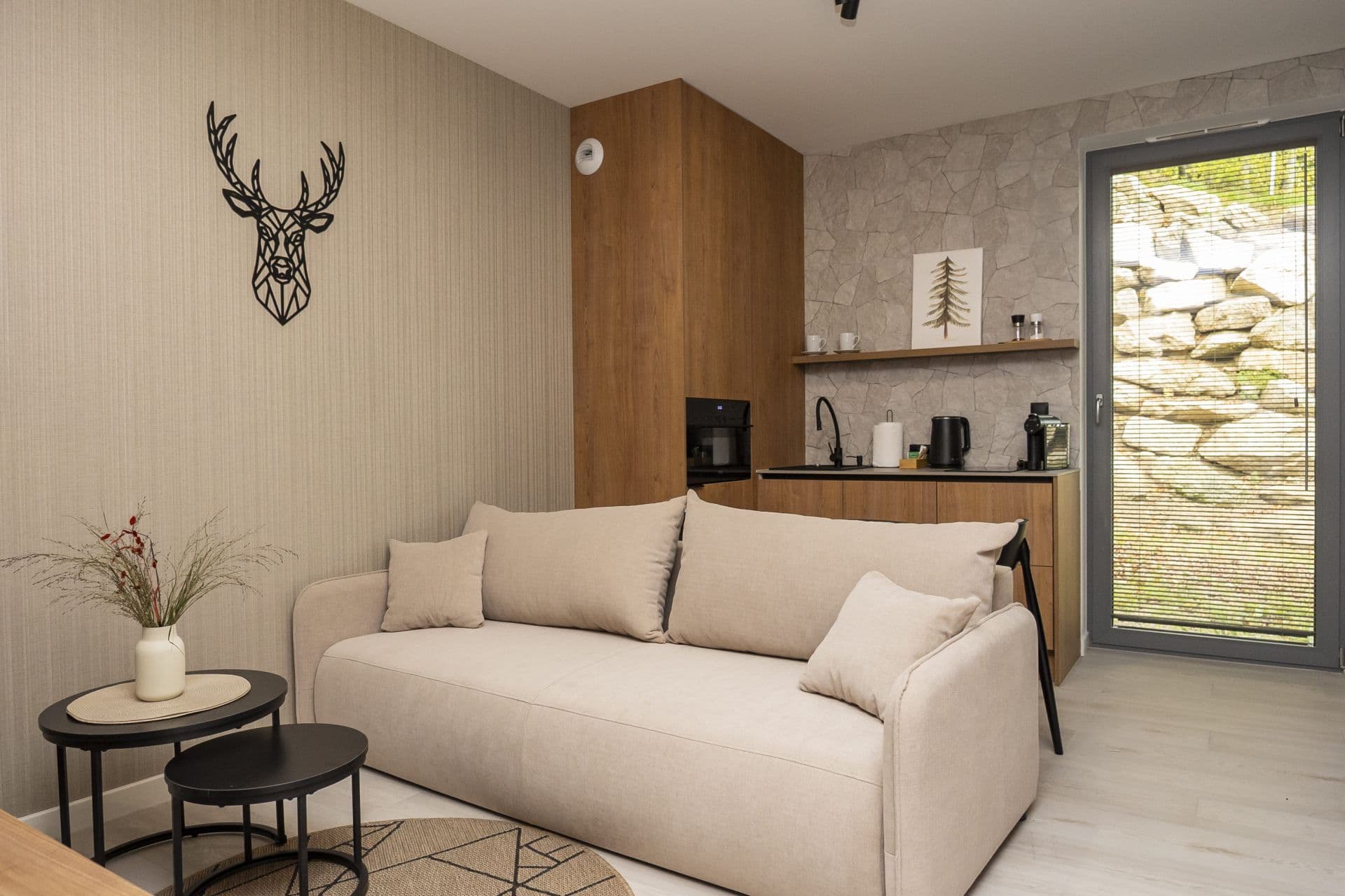 • Pokój dzienny z rozkładaną sofą i Smart TV.