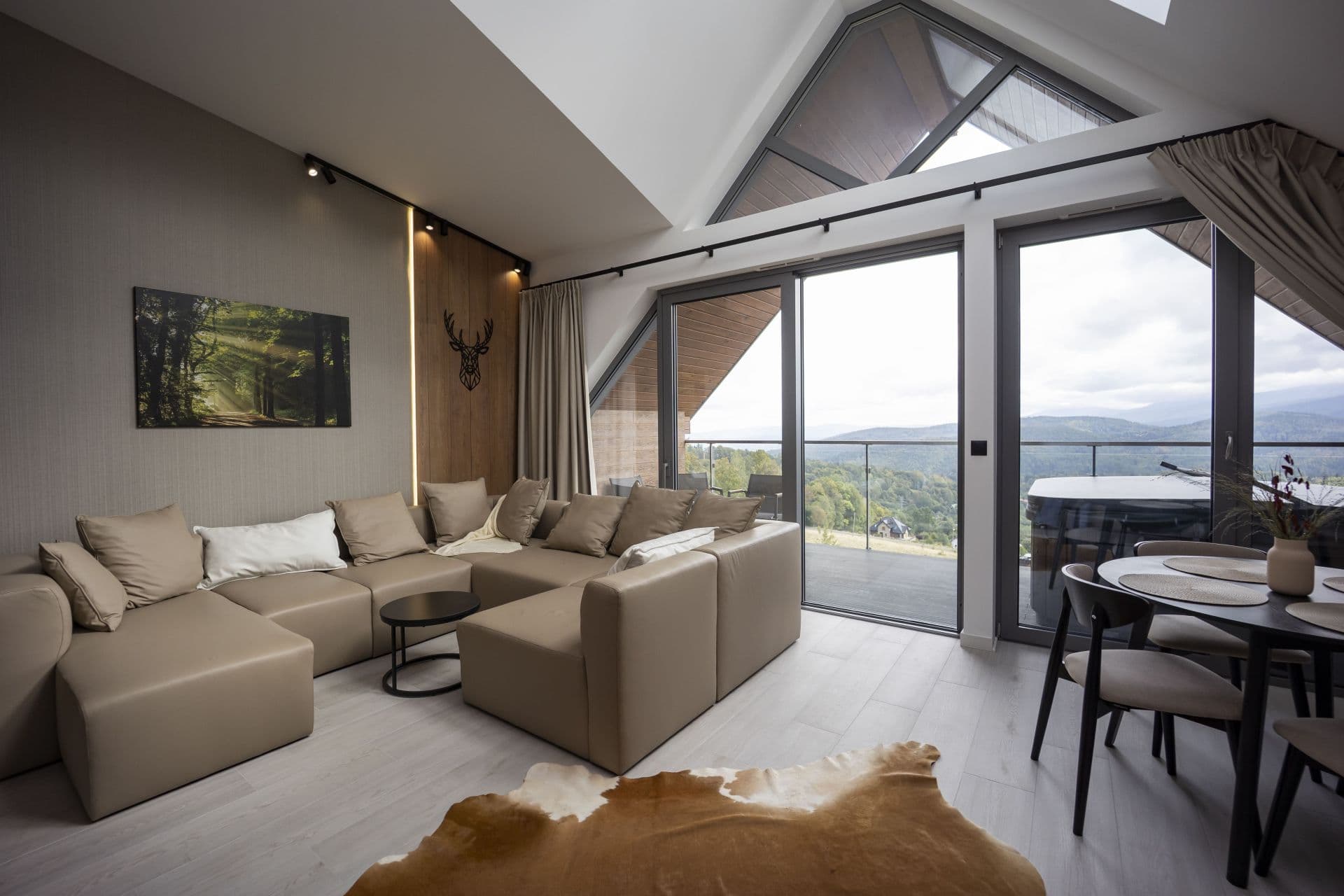 • Pokój dzienny z rozkładaną sofą i Smart TV.
