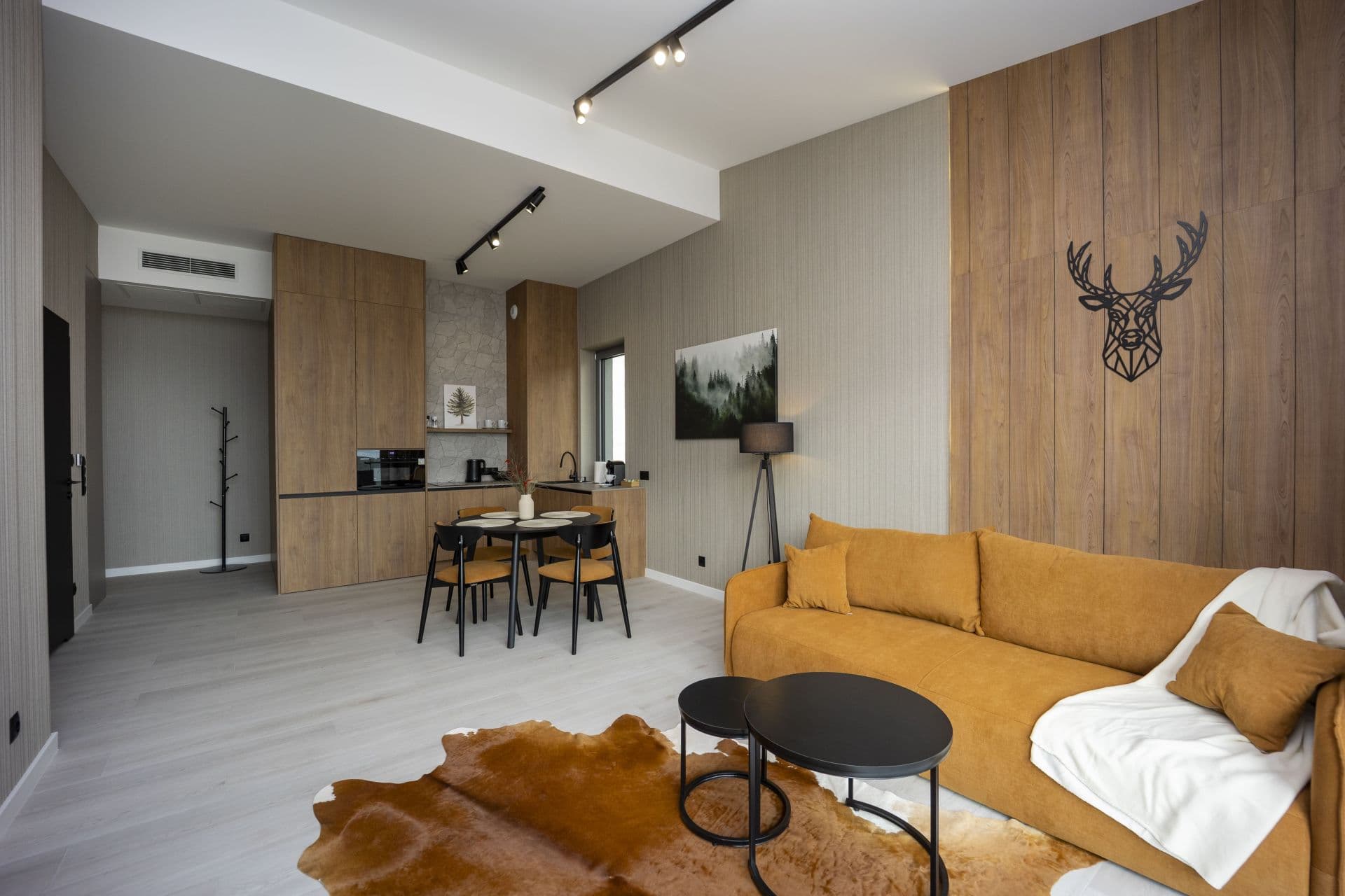 • Pokój dzienny z rozkładaną sofą i Smart TV.