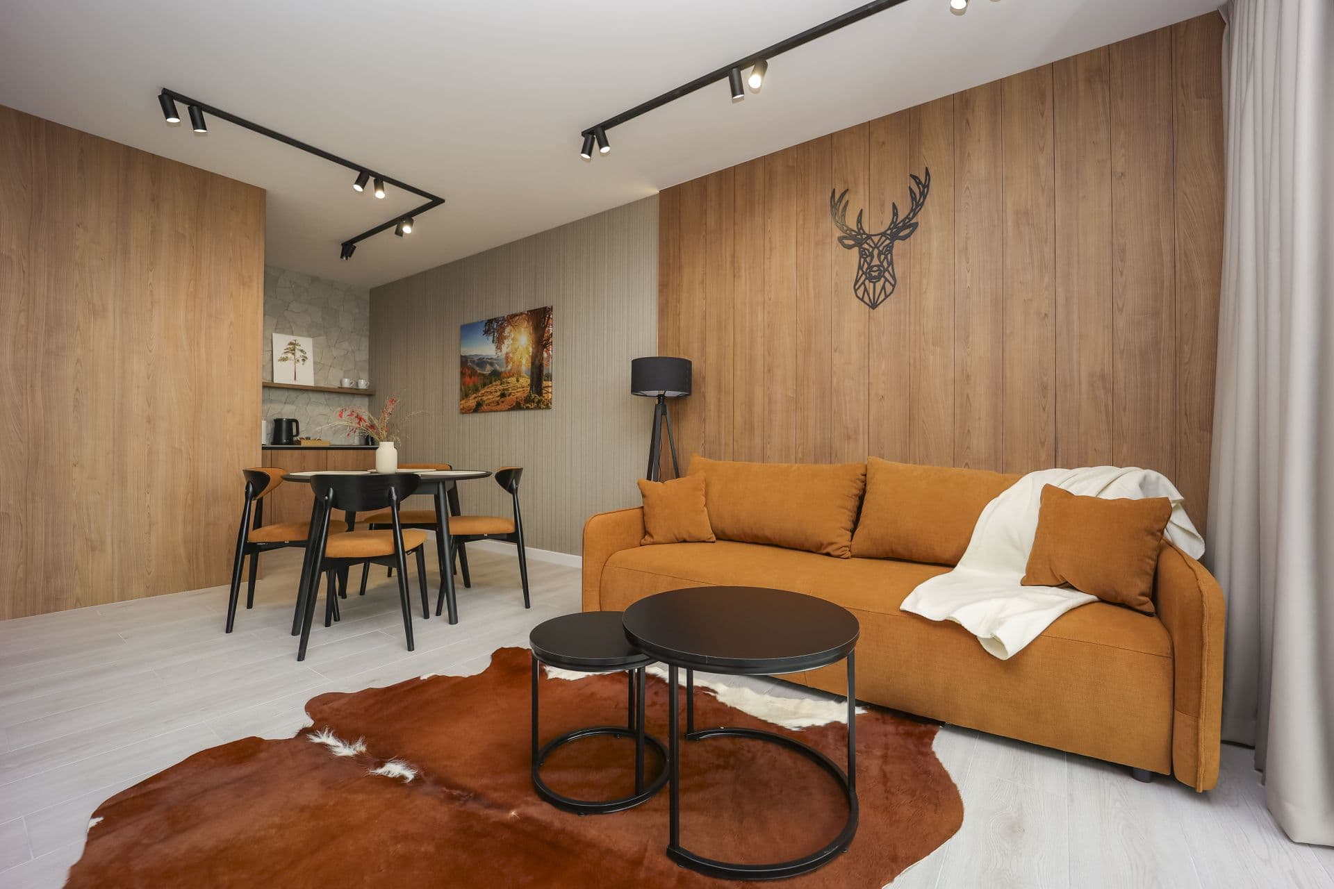 • Pokój dzienny z rozkładaną sofą i Smart TV.