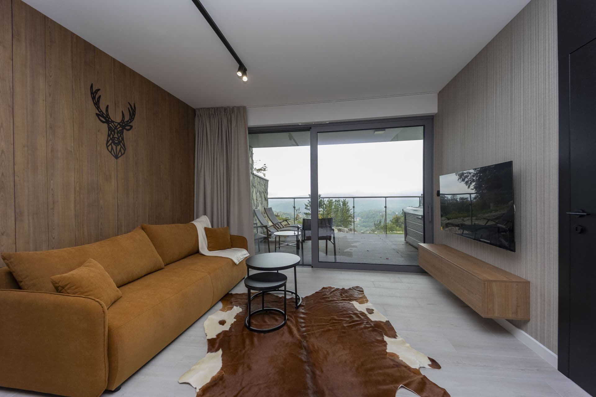 • Pokój dzienny z rozkładaną sofą i Smart TV.