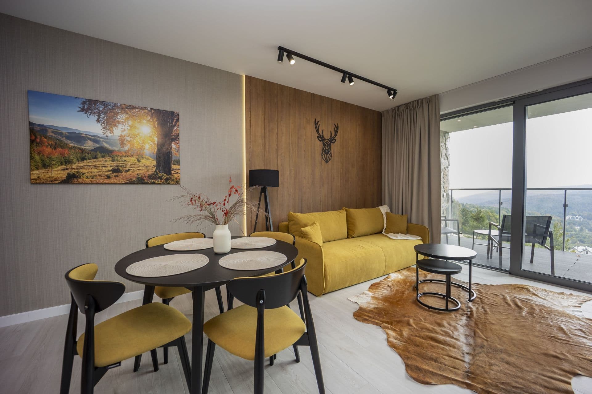 • Pokój dzienny z rozkładaną sofą i Smart TV.