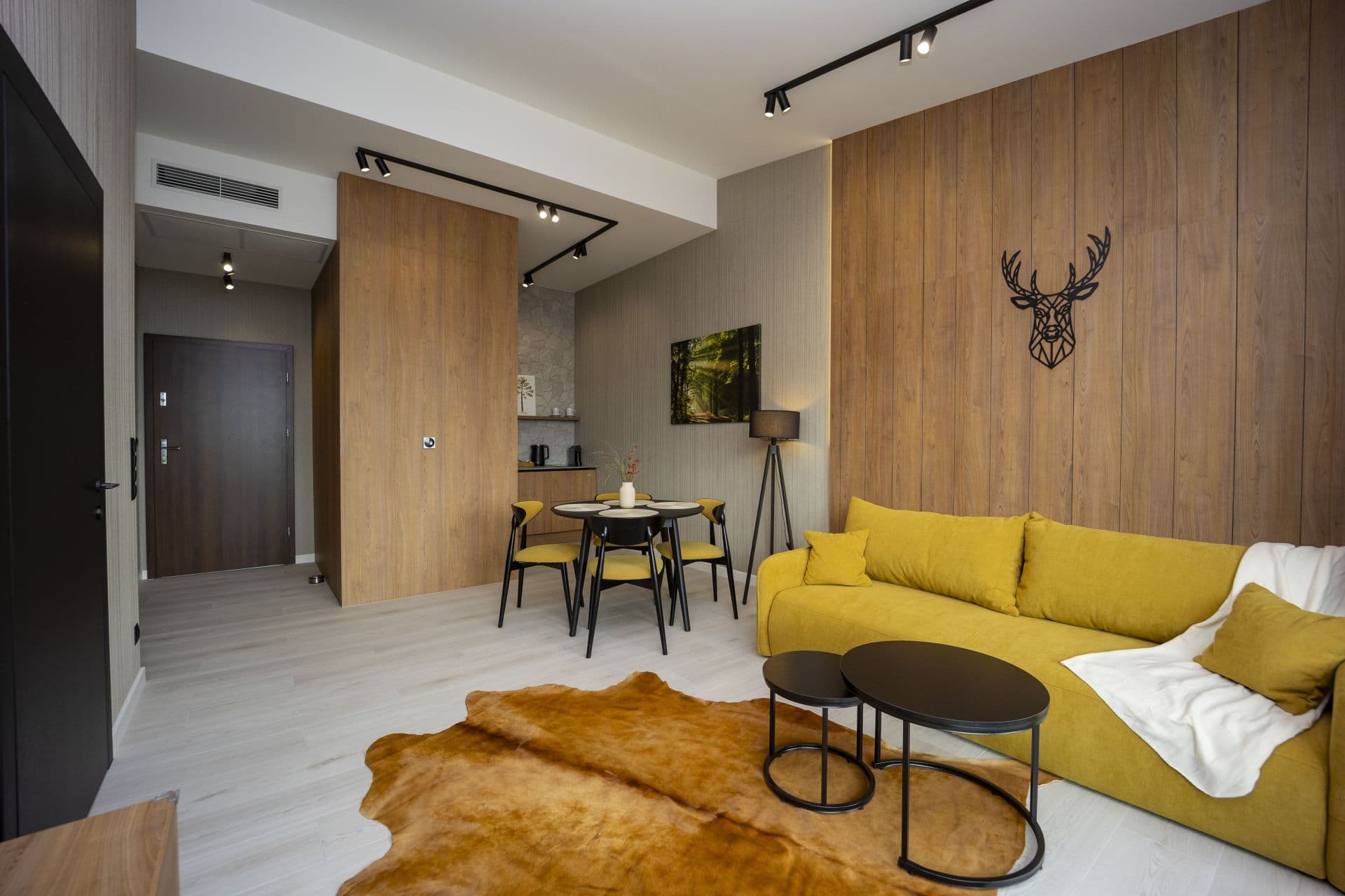 • Pokój dzienny z rozkładaną sofą i Smart TV.